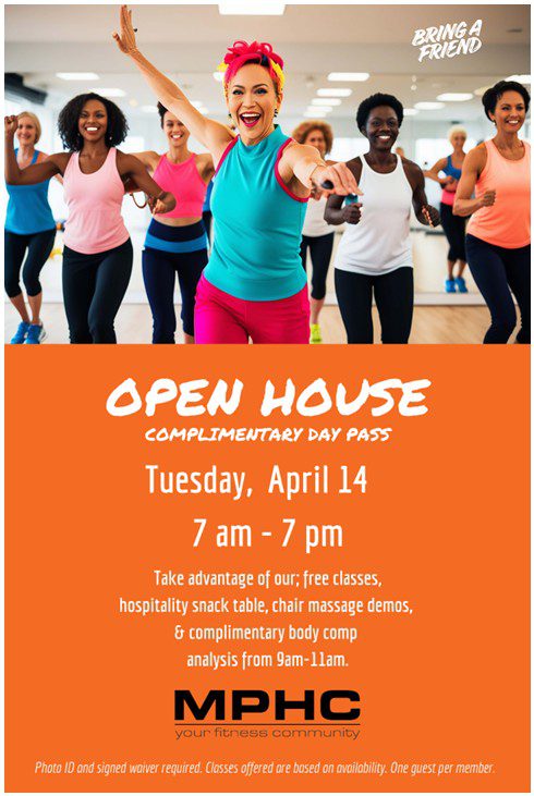 Join us for our Open House on Tuesday April 14th, 7am – 7pm, and take advantage of our free classes, hospitality snack table, chair massage demos and complimentary body comp analysis from 9am – 11am.  Photo ID and signed waiver are required.  Classes offered based on availability. One guest per member.