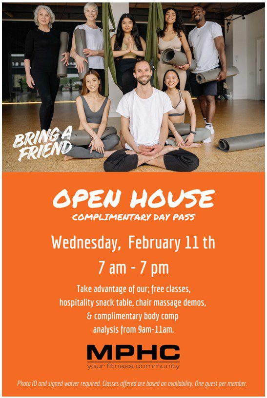 Join us for our Open House on Wednesday February 11th, 7am – 7pm, and take advantage of our free classes, hospitality snack table, chair massage demos and complimentary body comp analysis from 9am – 11am. Photo ID and signed waiver are required. Classes offered based on availability. One guest per member.
